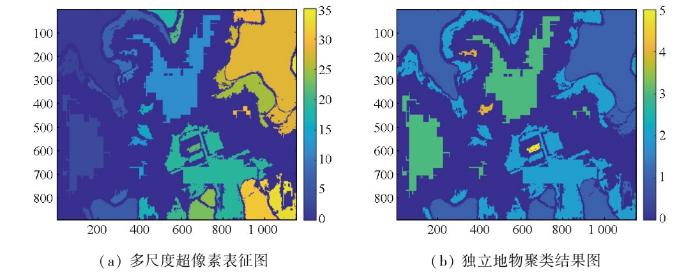 此外,在不同尺度使用LoG算子,可以模拟视神经NCRF对不同尺度的边缘进行辨识,并获取地物在不同尺度下组成的超像素斑块。在此基础上,将不同尺度的超像素表征图进行叠加,使相同地物的超像素相互覆盖,不同地物的超像素相互区分,最终得以通过多尺度的地物超像素对不同尺度的地物进行完善呈现,如图2所示。具体来说,首先将不同尺度超像素表征图缩放到相同大小;然后对不同尺度的超像素斑块进行腐蚀,腐蚀半径大小与尺度大小成比例,以保障相同地物叠加覆盖时,小尺度边缘可以得到保护;最后从多尺度叠加后的超像素表征图中筛除小面积噪声,并以4连通为依据对不同超像素斑块进行编号,形成独立地物的表征图。