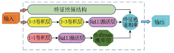 在解码方面,利用2个3×3卷积串联,第一个卷积感受野为 3×3,因第二个卷积的输入是第一个卷积操作后的特征图,所以最终输出的感受野大小相当于5×5,从而实现模拟5×5卷积的感受野,以此类推,通过多个3×3卷积模拟5×5,7×7,9×9的多重感受野,结合1×1卷积构建多卷积模板,结合残差连接和通道叠加,在避免过拟合的基础上解码不同尺度特征,采用一种类似层权重分配的机制,通过图5所示自注意权重分配结构,减少底层过多特征带来的细节噪声与运算负担,提高精度与效率[68],为进一步的通道相乘运算提供权重参数[67],并结合Softmax概率函数分割器,以交叉熵作为损失函数,构建多重感受野解码结构,进行解码分割,如图7所示。