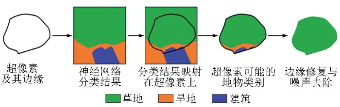 眼球微颤动自底向上认知背景、自顶向下解析细节,受此启发,本文提出了一种模拟眼球微颤动感知机制的错误修复思路,借助非监督分析提取出的超像素边界,滤除噪声并修复边缘。具体来说,在自底向上解析全局划分出的超像素的基础上,由于超像素内部具有较好的光谱一致性,可将每个超像素视为只包含单类地物的单元;以此为根据,将自顶向下神经网络辨识的地物类别结果,映射到每个超像素中,再以超像素中分布数量最多的地物类别作为该超像素的分割结果,获取所有超像素的分割结果,从而在保护边缘的前提下,滤除和修复由脏样本或过分割带来的细节噪声,有效提高分割精度,增强分割结果的可信度与实用性,如图9所示。