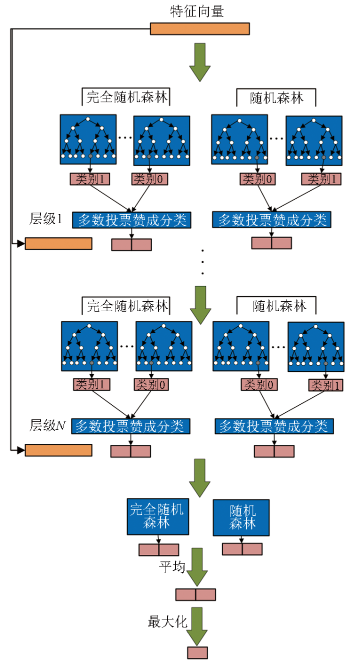 多粒度扫描作为初步CD的输出与级联森林之间的连接子网络,从上到下、从左到右对深度学习的输出进行处理,进一步关注特征之间的相关性,从而增强后续级联森林的分类效果。实验中每种类型的随机森林设置了100个决策树,决策树在生长到叶节点后停止生长。值得注意的是,多粒度扫描只是特征向量提取和分类的一个阶段,目的是获得更丰富的特征关系向量,为后续的级联森林提供强大的特征预处理基础。