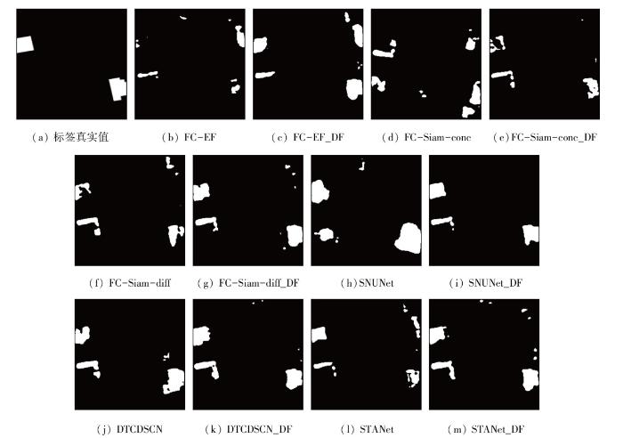 为了确认所提出的CDMDF的效果,将CDMDF添加到6种现有方法中进行比较,分别为: FC-EF,FC-Siam-conc,FC-Siam-diff,SNUnet,DTDSCN和STANet。这些方法在融合CDMDF之后分别重命名为FC-EF_DF,FC-Siam-conc_DF,FC-Siam-diff_DF,SNUnet_DF,DTCDSCN_DF和STANet_DF。本文引入了3个客观的评价指标来衡量每个检测结果与真实值的相似度,包括准确率、召回率和F1分数。准确率表示正确预测的正样本与实际预测的正样本的比例,召回率表示正确预测的正样本与正样本的比例,F1分数是准确率和召回率的调和平均值,可以更准确地表示分类的有效性。准确率越高表示误报率越低,召回率越高表示漏报率越低,F1分数值为准确率与召回率的谐波平均值。此外,在模型中使用了交叉熵损失,这个损失函数的选择也将在讨论中进行演示。计算公式为: