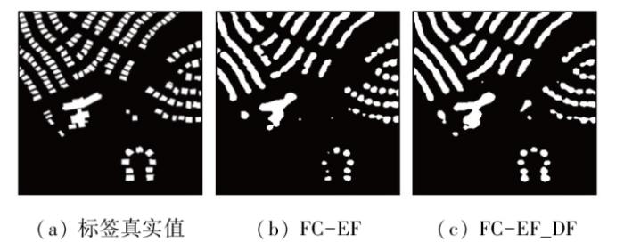 CDMDF的功能在于后处理,它进一步实现了通过深度森林的特征提取和分类。为了验证这种后处理方法的有效性,将其与聚类算法,如K-means算法进行比较,并将该算法记作FC-EF_clustering。FC-EF_clustering的原理是: 首先设置k个类别,从种群中随机选择k个样本作为聚类中心,然后遍历所有样本点,将所有样本点分类为k个类别(根据最短距离),更新k个样本的样本中心,然后重新划分所有样本点。停止条件可以设置为样本变化幅度不显著的情况,或者2个损失函数没有显着变化的情况。由于处理的是二进制图像,因而使用二进制聚类算法。将FC-EF模型和FC-EF_DF与FC-EF_clustering进行了比较,结果如图9所示。将图9(d)的细节之处与图9(a)—(c)细节之处对比可以看出,二进制聚类作为一种机器学习算法,其有效性并不稳定,因为聚类结果在很大程度上受初始聚类中心选择的影响。因此,参数的选择会导致有偏差的聚类结果,而这些结果并不普遍。另一方面,聚类算法在迭代过程中采用贪婪策略,试图在每个步骤中找到当前的最佳解决方案。但是,这种策略可能会导致算法陷入局部最优,无法实现全局最优。需要注意的是,本文目标不仅要提取更改区域,还要准确划分已更改和未更改的区域,即更清楚地定义更改区域的边缘。从图中可以看出,聚类算法大多对变化区域进行模糊处理,甚至直接将相邻的变化区域划分为同一个区块,这与本文的检测目标并不一致。