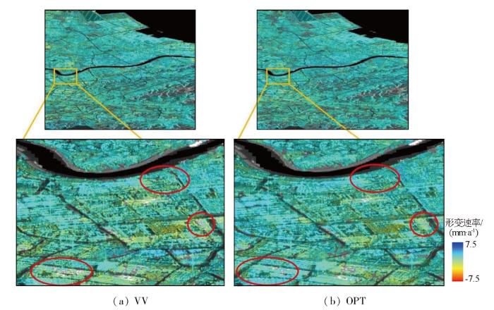 从图11的3处红圈区域更加清晰地看出,在极化优化之后,由于形变监测点的密度较大,所以所反演出来的形变细节也更为清晰。此外,在最左侧红圈区域中2种方法的监测形变结果呈现出显著的差异,产生这种差异的主要原因是在时间序列InSAR相位解缠的过程中,相干目标需事先构建空间网络,之后再进行模糊度解算,而空间网络的构建方式会直接影响到后续模糊度解算的准确性,进而对形变监测的结果产生很大的影响。目前Delaunay三角网是当前时序相位解缠的主流构网方法,评价构网质量的主要指标有三角网的密度以及三角网边的相位梯度大小,若网络形态包含高相位梯度边缘,导致违背相位连续性假设,会对形变监测结果产生较大影响[37]。通过前文的分析可知,经极化优化处理后得到的形变监测点的数量及其相位质量都有明显的提升,因此优化后使得相干目标的连接更加紧密,构建的三角网密度更大,效果更好,能够更加准确地捕捉到细微的形变变化,可以更详细地反演真实地表形变,从而提高了地表形变监测能力。