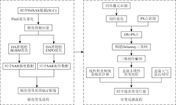 不同于以往的PolPSI技术,为了进一步提高监测点的密度,本文将DS-InSAR引入时序极化优化中。根据DS点选取受邻域像元影响的问题,本文将时序SAR数据的强度信息和相位信息分别使用不同的极化优化方法,以此得到极化优化后的SLC影像,并使用优化后的影像联合PS点和DS点进行地表形变监测,具体流程如图3所示。
