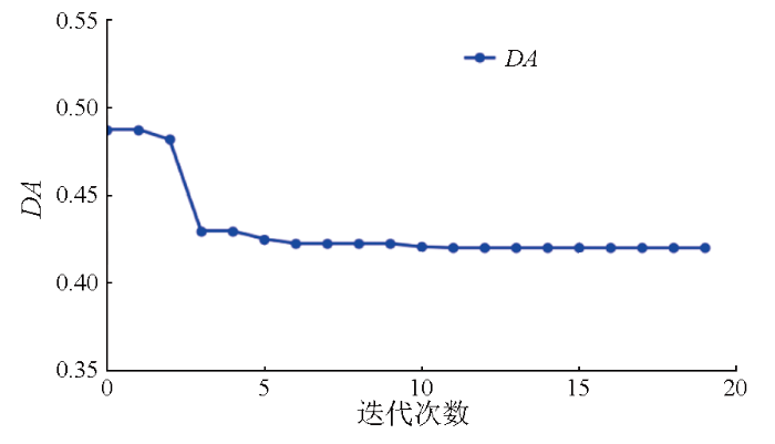 为了验证加入PSO算法对运行效率的提升,分别针对单个像元及研究区整体运行时间及运算结果进行分析。电脑配置为12th Gen Intel(R) Core(TM) i7-12 700单线程运算,对于单一像元[566,1 151],在设置ESPO方法搜索步长为3°情况下,运行时间为0.08 s,最小DA值为0.4 198; 加入PSO算法后,在设置粒子数5,迭代次数20的情况下,同一像元的优化时间为0.003 s,最小DA值为0.4 196,其具体迭代情况如图5所示。对于研究区整体来说,其大小为2 000×2 500像元,在设置参数不变的前提下,ESPO方法预计需要120 h,而PSO算法仅需2.5 h。由此可以看出PSO算法能够极大提高极化优化效率,且求出的最小DA值也要优于ESPO方法。为了更合理地设置PSO算法的参数,以提高运行效率,经过多次实验得出,在设置粒子数5,迭代次数10的情况下,绝大多数像元均能达到收敛状态,因此在接下来的实验中,PSO算法采用该参数设置。