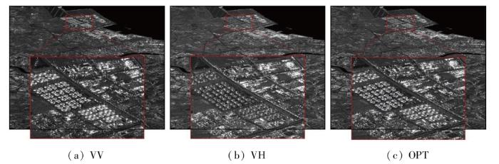 研究表明,经极化优化后,强度影像的旁瓣效应与噪声均在一定程度上有所减轻。图6呈现了VV,VH,极化优化后(OPT)这3种方式获取的时序平均强度图,从红色方框内放大的子区域能够更清晰地看出,VV极化因人工建筑等强散射体对周围弱散射体回波信号产生严重干扰,致使建筑物边界模糊; VH极化因强弱散射体回波信号均较弱,使得地物难以辨别; 而极化优化处理有力地抑制了旁瓣效应,提升了不同地物间的对比度。
