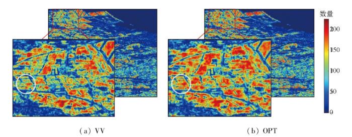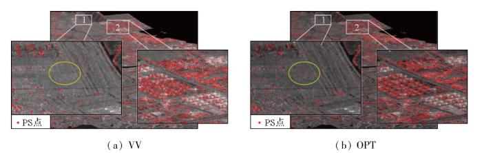 为分析VV极化与极化优化2种不同数据对DS点识别的影响,实验分别对同质像元识别结果和最终DS点的选点结果分析讨论。图8分别显示了2种方法得到的同质像元识别数量分布图。结合图2进行分析可以看出,地表覆盖类型会对同质像元的识别产生影响。以城市区域为例,城市的建筑物散射特性较强,导致选取的同质像元数量相对较少。相比之下,裸地或低矮植被覆盖区域等属于典型的分布式目标集中区域,所以在这些地方选取的同质像元数量会比较多。由此可见,不同的地表覆盖类型具有不同的散射特性,进而影响了同质像元的识别结果。为了更直观地对比优化的效果,实验选择红框区域进行对比分析,通过图8对比分析可得: 极化优化能够显著提高同质像元识别的数量,并且能够提高同质像元识别的准确性。如图8中白圈区域所示,(b)中该区域的同质像元数量明显高于(a),并且地物框架则十分明显,说明此时同质像元和异质像元能够被很好地区分。