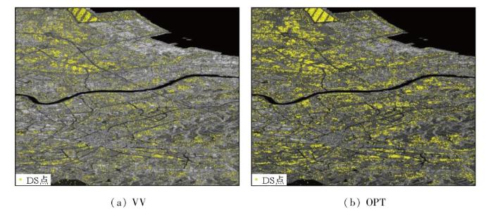 之后基于同质像元识别结果,进行DS点选择。DS识别分布对比如图9所示,其中底图为研究区的平均强度图,黄色点表示DS点。经统计得出,VV极化下DS点数量为358 869个,而极化优化处理后识别出的DS点数量为565 117,增长了约57.5%。