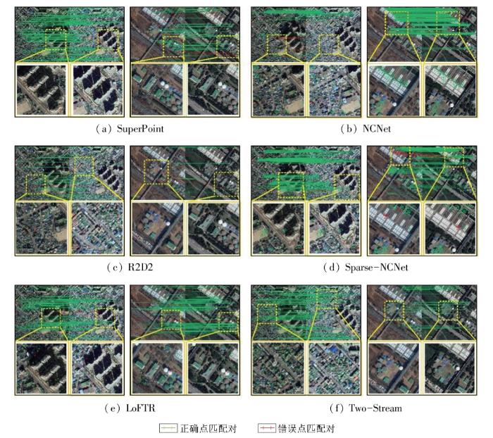 可视化对比结果如图7 所示。如第一组图像所示,该图中地物类型简单,但特征提取网络SuperPoint和R2D2仍在如局部图所示的土壤覆盖和红色建筑物区域出现了明显错误匹配。而NCNet,Sparse-NCNet和LoFTR网络能较好地分辨此示例中不同类型的地物特征,具有良好的匹配效果。同时Two-Stream网络在红色建筑物区域的不同位置也出现了明显匹配错误。其次,第二组图像聚焦于城市区域,该区域内建筑物空间尺度较大,与道路交错分布。SuperPoint和R2D2网络仍因其使用传统匹配方法而表现出较差的匹配性能,在图中空间分布不同的橙色建筑物区域产生了错误匹配。NCNet,Sparse-NCNet和LoFTR网络在该示例中表现出较好的匹配性能。而Two-Stream网络受其卷积核感受野限制,不能准确分辨不同车辆在不同区域的地物特征,出现了错误匹配。