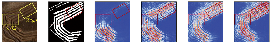 整体上看,U-Net对图像中的精细纹理部分置信度大,但其在部分大尺度区域置信度不高; ASPP-UNet在添加ASPP模块后提高了大尺度区域的置信度; SegFormer在此基础上,提升了难分区域的置信度,但在一些精细纹理部分置信度反而降低。而BenchSegNet有效增强了模型在台阶区域上的置信度,结合了U-Net浅层架构和SegFormer模块的优势,有效提取矿区台阶位置。