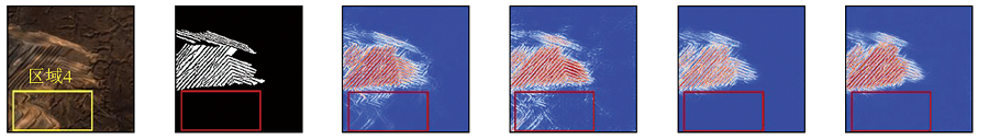 然而本文模型依旧存在一些问题,比如总体精度不高,台阶内部存在空洞,在外部仍有少量像素被误检等。此外,模型输入端存在2个接口,包括原始影像和特征增强结果,需要进一步优化以减少操作程序。模型可以从以下方面进行改进: ①采用更高空间分辨率的光学影像,这可解决原始影像所提供的有效特征不足的问题; ②将面向对象方法与深度学习技术融合,这可有效应对台阶内部的空洞问题,同时也能减少背景点的误检情况; ③融合高光谱影像、合成孔径雷达、激光雷达等多源数据,综合利用多维度特征进行台阶的有效提取。