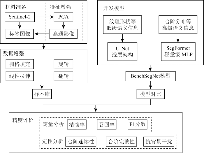 ①利用主成分分析(principal component analysis,PCA)和高通滤波对Sentinel-2影像进行增强,然后绘制台阶的标签; ②对训练样本进行优化处理,包括栅格填充、线性拉伸,同时为了扩展数据集进行旋转、翻转等数据增强操作; ③基于U-Net浅层架构和SegFormer,开发针对露天煤矿台阶提取的深度学习模型BenchSegNet; ④利用精确率、召回率、F1分数等指标评估BenchSegNet的表现,并与其他算法比较。