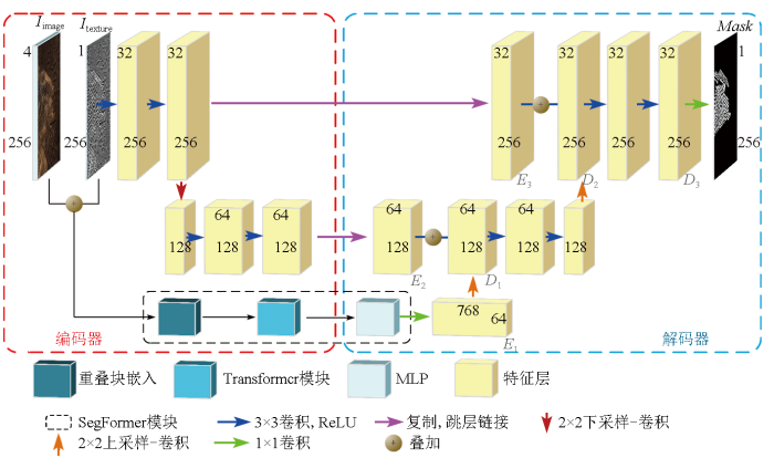首先在编码器部分,将Iimage和Itexture融合为{H×W×(C1+C2)}的多通道图像Iconcat,将其输入到SegFormer模块中处理,经1×1的卷积操作后输出对应大小为{