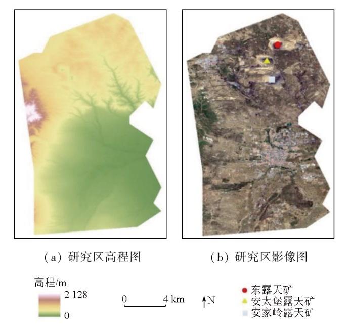 为突出对比露天采矿活动以及城镇建设导致的生态环境变化,本文选取山西省平朔朔南矿区和南部主城区作为研究对象(图1)。平朔朔南矿区是我国主要的煤炭生产基地,整个煤矿区设计年产煤炭8 100万t,包括了目前规模最大、技术最先进的露天煤矿: 东露天矿、安太堡露天矿和安家岭露天矿。矿区位于山西省朔州市西北部(112°14'~112°32'E,39°9'~39°37'N),地处黄土高原东部地区,为典型的温带大陆性季风气候。地形轮廓总体上是北、西两面环山,山势较高,中间是桑干河域冲积平原,相对较低。平朔朔南矿区长时间煤炭开采形成的露天采场、排土场以及配套的工业用地等典型地物直接影响着研究区地表生物和物理特征,持续破坏着研究区原本脆弱的生态环境[19]。