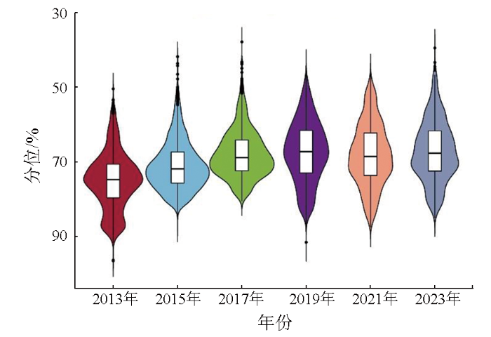本文借助小提琴图和比例弦图对OMRSEI的变化特征进行了深度剖析。小提琴图以其独特优势,不仅精准描绘了各年份数据的分布形态,而且展示了数据的集中趋势与离散程度。本文构建了涵盖各研究年份的小提琴图,如图3所示。其中,箱体部分精确反映了各年份OMRSEI在25%及75%分位数的数值,箱体中间的横线则代表了各年份OMRSEI均值。从图3看出,除2021年OMRSEI均值略微波动外,研究区生态环境质量总体呈上升趋势。具体而言,2013—2019年,OMRSEI均值均呈现出逐年递增的趋势,表明研究区的生态环境质量在此期间得到了显著改善。尽管2021年OMRSEI均值相较于2019年小幅降低,其整体依然维持在一个较高的水平。这些数据综合反映了研究区在生态环境保护方面所取得的积极成效。比例弦图由环和弦构成,环的长度表示该类别所占的比例,弦的宽度表示2个类别之间的转换强度。为进一步量化平朔朔南矿区生态环境质量,本文构建了各个研究年份之间生态质量变化比例弦图,以揭示OMRSEI各等级在所选时间段内的转换情况,如图4所示。从图4看出,各等级OMRSEI均发生较为频繁的相互转化,其中转化趋势较大的是2013—2015年,OMRSEI由差转换为中。尽管平朔朔南矿区生态质量逐步改善,生态环境质量优、良的总比重从2013年的13.51%增长到2023年的47.63%,但OMRSEI为差、中在矿区生态质量分级体系中的比重仍超过50%,因此平朔朔南矿区生态修复亟须实施更为有效的治理与修复措施,以促进生态环境的整体提升,实现可持续发展目标。