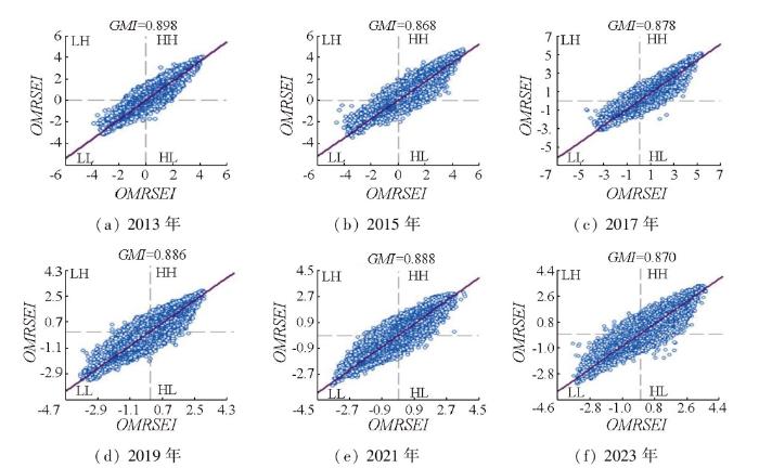 本文基于GMI,构建了能够反映平朔朔南矿区空间自相关结果的莫兰散点图,如图5所示,图中LH,HH,LL和HL分别为低高聚集区、高高聚集区、低低聚集区和高低聚集区。散点主要分布在第一、三象限,说明OMRSEI等级空间分布具有较强正相关性,呈聚集性而非随机性。从变化趋势来看,全局莫兰指数值波动下降。2013年,OMRSEI呈现大面积聚集,GMI最高,达到0.898,OMRSEI的空间聚类程度较高。2015—2023年,生态修复使得完整大块生态较差地区内部出现优良,生态斑块逐渐破碎,表明OMRSEI空间聚类度下降。