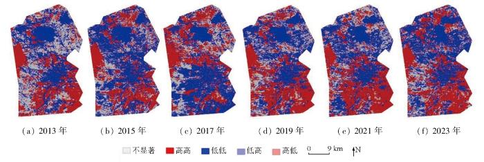 本文基于LMI进行空间自相关分析,并利用LISA聚类可视化了OMRSEI的5种聚类特征,即不显著、高高、低低、高低以及低高,由图6所示。平朔朔南矿区生态环境质量空间自相关特征以高高聚类和低低聚类为主,说明研究区OMRSEI的空间分布相互联系紧密。其中,低低聚类主要集中在露天煤矿区和朔州市区,高高聚类集中在中西部林地和东南部耕地。高高聚类和低低聚类大致分别对应生态环境质量的改善和生态环境质量的退化,这与其他学者研究结果保持一致[29]。2013—2023年间,低低聚类对应的生态环境质量退化区域逐步减小,高高聚类对应的生态环境质量改善区域逐步增加,进一步说明了露天煤矿开采以及城镇发展对生态环境的扰动,矿区排土场修复、朔州市生态扩容等措施对生态环境的修复作用。
