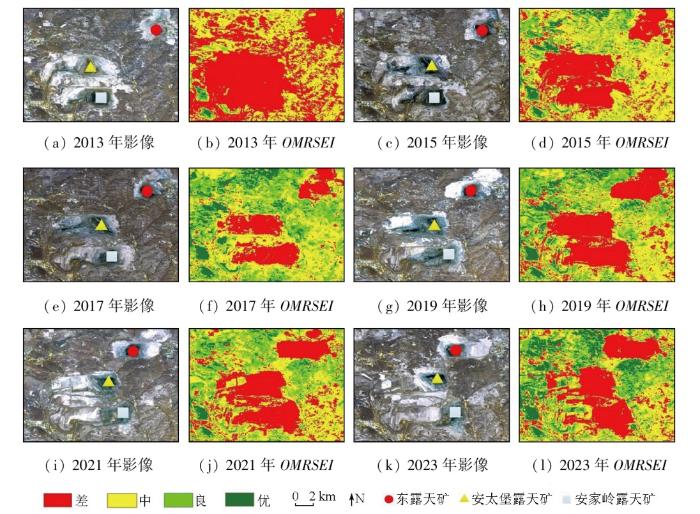 将露天矿实际影像和OMRSEI进行分级对比,如图9所示。从中可以看出,2013—2023年期间,安太堡露天矿和安家岭露天矿排土场逐步修复,露天采场呈现东移态势。2013—2019年间,东露天矿开采加剧,露天采场及排土场逐步扩增,2021—2023年间,东露天矿北部外排土场逐步修复。受集约采矿活动和环境修复影响,安太堡露天矿和安家岭露天矿OMRSEI评级为差、中的板块逐步缩小。至2023年,安太堡露天矿和安家岭露天矿西部排土场OMRSEI评级到达优、良。东露天矿OMRSEI变化也和遥感影像呈现的排土场面积变化一致,呈现先增加后减少的趋势。综上,利用OMRSEI指数评价的矿区生态和实际趋势情况一致,这说明应用OMRSEI描述矿区生态环境质量是合理的。