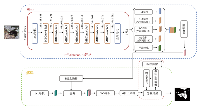改进的DeepLabV3plus模型结构如图4所示,其中编码部分的红色框为模型改进部分。编码器由骨干网络和空洞空间金字塔池化模块(atrous spatial pyramid pooling,ASPP)组成。在编码器部分,使用预训练的 EfficientNet-B4 作为骨干网络对输入影像进行多层次的特征提取,输入影像为256×256×3,经过初始3×3卷积层和多个移动端逆残差模块(mobile inverted bottleneck convolution,MBConv)逐步进行特征提取与压缩后,其通道数不断增加,最后得到1 792维的特征向量。这些特征向量通过不同尺度的空洞卷积进行多尺度特征提取,生成具有丰富上下文信息的深层次特征图。其中 MBConv最早由 Sandler等[23]提出,是 EfficientNet 中广泛采用的轻量化卷积模块,其采用“先升维-深度可分离卷积-再降维”的倒残差结构,并结合了残差连接以提升梯度传递能力。 图中所示的 MBConv1 与 MBConv6 的主要差异在于扩展因子不同: MBConv1 表示扩展因子为 1,即输入与中间特征维度相同; MBConv6 表示扩展因子为 6,即中间特征维度为输入的 6 倍,从而增强非线性表达能力。在解码器部分,模型首先对编码器输出的特征图进行 4 倍上采样,然后通过特征融合操作将这些深层次特征图与编码器的低级特征图进行拼接。拼接后的特征图通过 3×3卷积进一步处理,以减少通道数并强化关键信息。在完成卷积操作后,再次进行 4 倍上采样,使特征图恢复至与输入影像相同的分辨率。最后,通过预测结果与真实标签的比较计算损失函数,并引入在线难样本挖掘(online hard example mining,OHEM)机制,对高损失像素进行筛选,仅保留难分类样本参与梯度反传,从而实现模型参数的迭代更新。最终,模型输出与原始影像大小一致的分割结果。