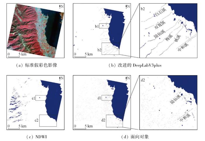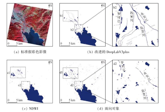 由图5可知,3种方法均能准确提取出洱海北部大面积水体,目视效果较好。各方法的差异主要体现在噪声、细长水体及山体阴影等细节处。在b2的局部放大图中可以看出,改进的DeepLabV3plus模型对细小河流的分割能力较强,且能提取出主要入湖河流(弥苴河、罗时江、西闸河和永安江)的水系形状,提取的水系呈现“爪”型,最大程度地保持了河流的连续性。NDWI方法在细小水系的提取上表现欠佳,湖泊边缘提取不够清晰,在重点对比区域c2中也几乎识别不到细小河流的水体像元,且存在许多噪声,导致漏提率较高。面向对象方法虽然改善了NDWI方法对细小水体提取的不足,但还是出现了水体的“断流”现象,同时伴随着出现了山体阴影像元错分的现象,虽然能很好地区分水体与非水体,但还是存在误提现象,如d2的局部放大图中,面向对象方法只提取到了断续的“三江”水系,且提取的水体中含有山体阴影。