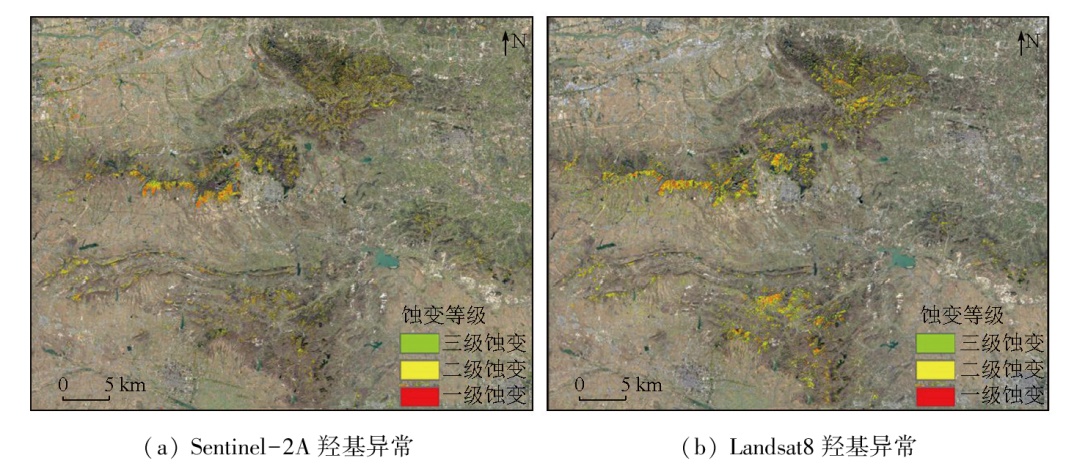 | 图7 Sentinel-2A和Landsat8的PCA羟基异常分布图 |