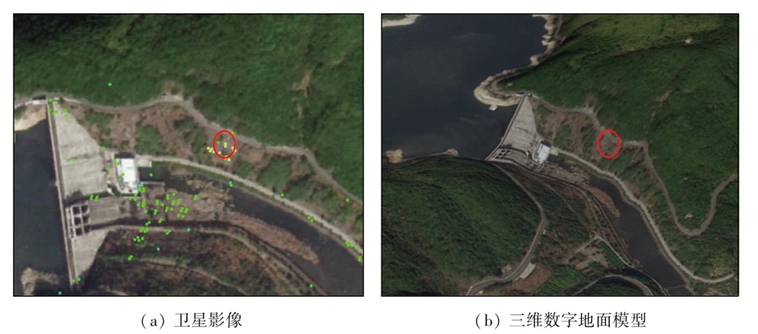 | 图12 野外核查形变点在卫星影像与三维数字地面模型上的位置示意图 |