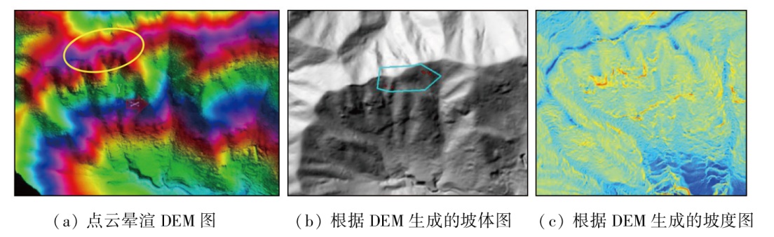 | 图21 点云渲染DEM图与根据DEM生成的坡体、坡度图 |