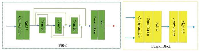 在整体网络架构中,FEM在不同尺度的特征图下使用,用来增强与提取不同尺度下的光谱信息与空间信息,具体模块架构如图2 所示。该模块采取稠密神经网络的思想对输入的特征图信息进行增强,主要分成3个部分,前后2个部分都为卷积层加激活函数,中间部分由3个卷积层相互稠密跳连形成,该设计能够极大地提升网络的学习与泛化能力。