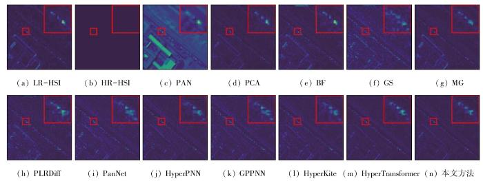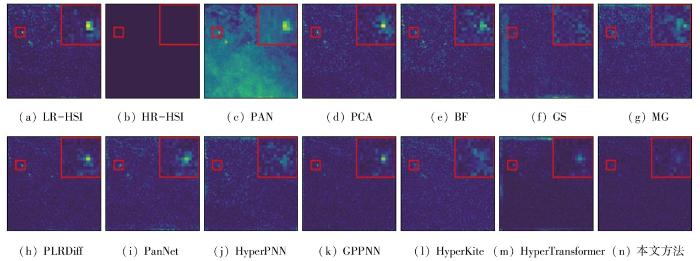 在Pavia Center和Botswana数据集上进行了降低分辨率下的实验,定量实验结果如表1 和表2 所示(其中加粗的为最佳值),定性可视化实验结果如图4 —7 所示。从定量实验结果可以看出,本文提出的三流Transformer在这2个数据集中取得了最好的效果。由于高光谱遥感图像的空间分辨率较低,很难通过整个图像来直观地评估其性能。因此,本文从测试图像中随机选择一个图像进行可视化展示,并进行局部放大显示,以更准确地评估各种全色锐化方法的性能。例如,对于其中一张的测试图像,来源于Pavia Center数据集,如图3 所示,三流Transformer更接近真实的HR-HSI,而BF,MG,PLRDiff,PanNet和HyperPNN等方法均有一定程度的光谱畸变。此外,PCA还有一定的空间畸变。由HR-HSI和地面实况HR-HSI之间的差异生成的残差图,如图4 所示,进一步证实了本文方法全色锐化效果最好这一结论。