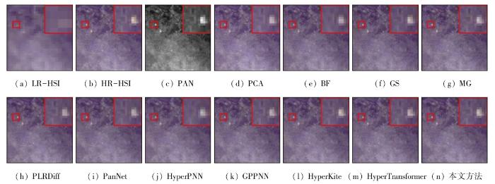 为说明本文提出的全色锐化方法的实际应用能力,基于Chikusei数据集进行了全分辨率实验,并利用真实的高分辨率全色图像与低分辨率的高光谱图像进行融合对比,可视化实验结果如图10 所示,实验结果见表4 。由于缺乏HR-HSI作为参考,实验只能在没有参考的情况下去计算质量评价[37 ] (quality-with-no-referance,QNR)、光谱损伤指数(${D}_{\mathrm{\lambda }}$ ) 和空间破坏指数(Ds )。其中,${D}_{\mathrm{\lambda }}$ 用于评估原始LR-HSI和生成的HR-HSI之间的光谱相关性; Ds 用于评估原始PAN和生成的HR-HSI之间的空间相关性; QNR 为${D}_{\mathrm{\lambda }}$ 和Ds 相结合的综合指标。