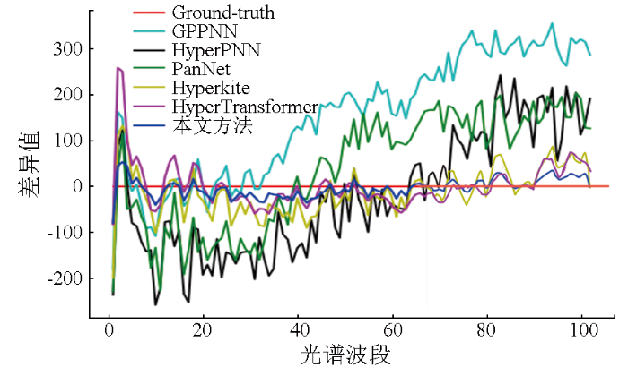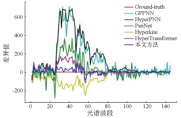 为了进一步评估不同HSI全色锐化方法的光谱保存能力,从2个数据集中随机选择一个像素,并绘制其光谱差异曲线,如图8 、图9 所示。显然,本文提出的全色锐化方法具有最好的性能,其次是Hyper Transformer。本文方法在大多数波段误差较低,这也表明其能更好地重建HR-HSI。