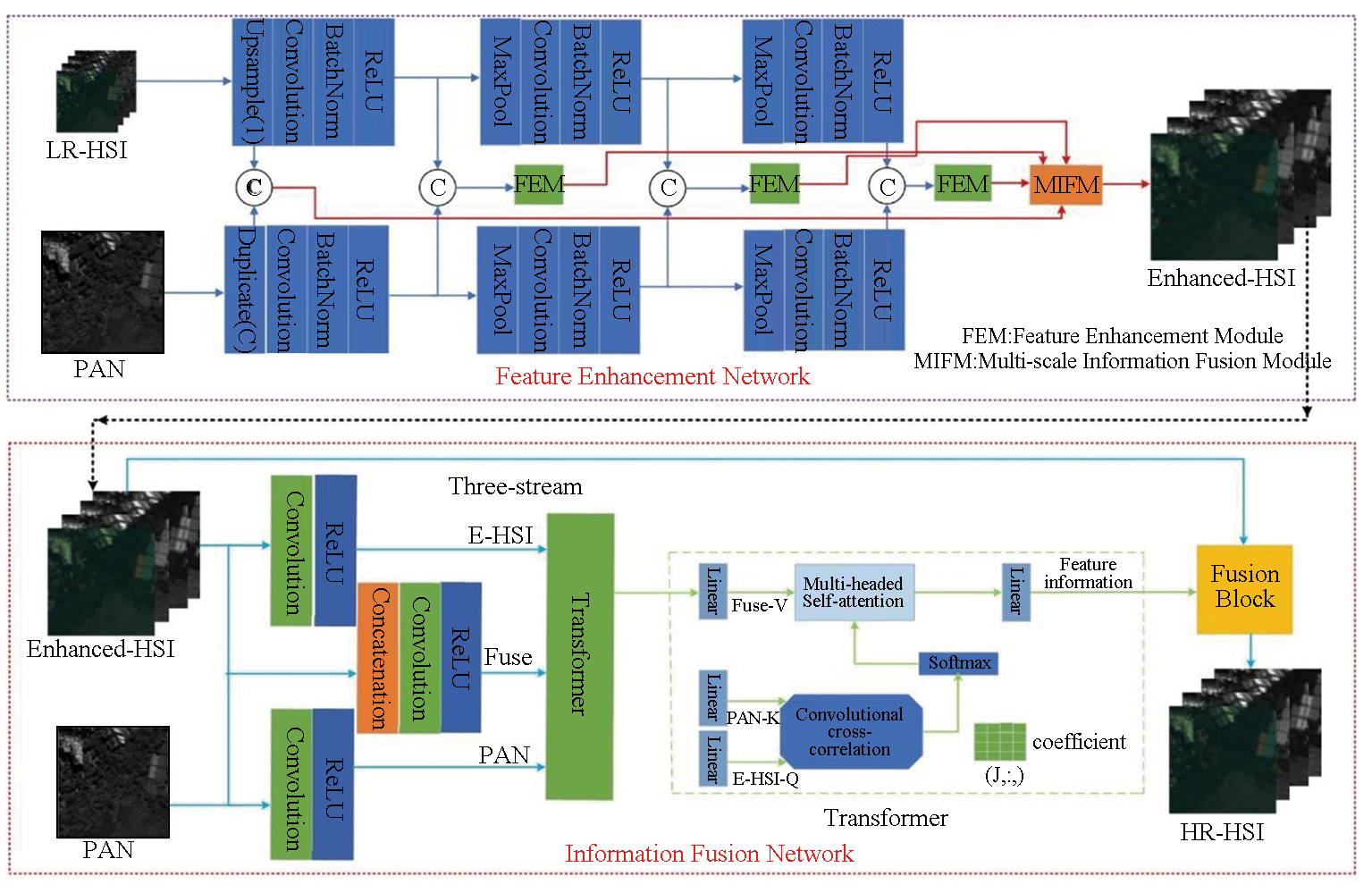 基于特征增强和三流Transformer的高光谱遥感图像全色锐化 |