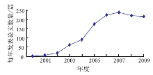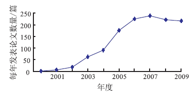 | 图1 2000~2009年我国MODIS应用论文的年产量Fig.1 The annual production figure of China’ s MODIS application papers (2000~2009) |