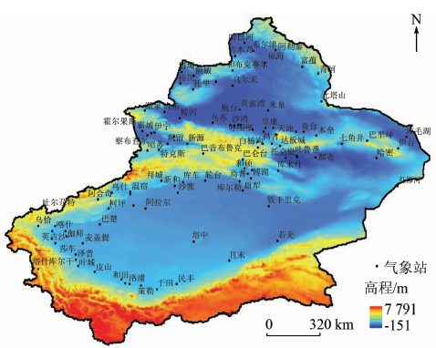 以新疆维吾尔自治区为研究区, 其处于典型的温带大陆性干旱气候带, 年均降水量155 mm。区内山脉融雪形成众多河流, 绿洲分布于盆地边缘和河流流域, 总面积约占全区面积的5%, 具有典型的绿洲生态特点。新疆降水存在比较明显的时空分布不匀性— — 山区降水多于平原与盆地, 北疆降水多于南疆, 且降水量从西北向东南部渐减; 在时间分布上, 降水主要集中在夏季, 夏季降水量占全年降水量的60%以上[16]。研究区105个气象站点与高程分布如图1所示。