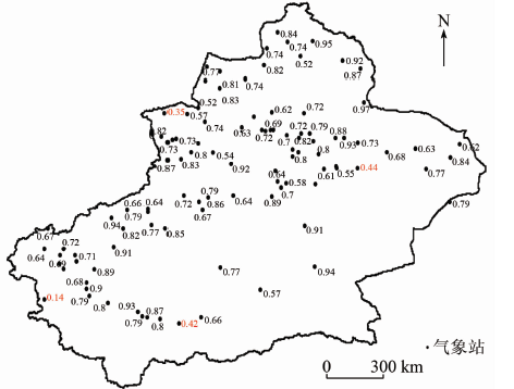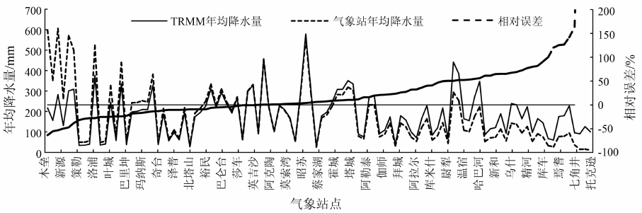 各实测气象站点之间的相对误差具有不均匀性, 差异明显。其中莎车、额敏、伊宁、英吉沙、特克斯、富蕴、阿克陶及沙湾8个气象站点的相对误差在± 1%以内, 说明TRMM月降水数据和这些气象站点实测降水之间有非常好的一致性; 而超过± 50%误差的站点达到了30个, 尤其是鄯善、焉耆、和静、塔什库尔干、七角井、吐鲁番及托克逊7个站点的误差超过了100%, 说明在这些站点TRMM降水数据的高估超过了1倍, 通过计算该7个站的年平均降水量只有45 mm; 误差在-40%以上的天池、木垒、小渠子、米泉、新源、白杨沟6个站点的年平均降水量则达482 mm, 均位于新疆降水比较充沛的地区。以上情况证明了TRMM降水数据在降水较少的区域容易高估降水、而在降水量较多的区域容易低估降水的现象, 这与吴雪娇等[18]的研究结果是一致的。