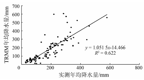 从图11可以看出, 虽然通过上述分析相对误差在± 30%以上的站点占到新疆全区国家站点的40%, 但其相关系数却达到了0.81, 而且无论从整体精度评价, 还是年降水量、季降水量、月降水量检验来看, 都说明TRMM降水数据与台站实测降水具有很好的一致性; 同时也说明TRMM降水产品的偏差在时间和空间上具有一定的规律性, 在具体使用中需要进一步订正处理[11, 15]。