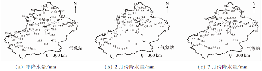 气象台站的实测月降水资料由新疆气象局信息中心提供, 其时间尺度与遥感数据一致。本文选用月降水资料的获取时间为2月和7月, 分别代表新疆地区降水少和降水多的2个月份。图2示出1998— 2013年气象台站的年均降水量及2月和7月的月降水量。