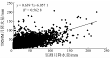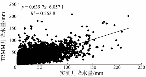 | 图3 1998— 2013年TRMM与实测月降水量散点趋势Fig.3 Scatter diagram of monthly precipitation between TRMM and rain gauges from 1998 to 2013 |