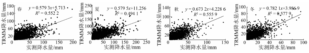 | 图5 不同季节TRMM与实测季降水量散点图Fig.5 Scatter plots of seasonal rainfall with squared correlation coefficient using TRMM and rain gauge for different seasons |