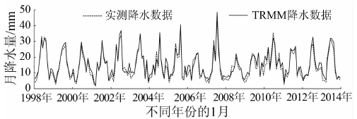 | 图6 TRMM与站点观测1月份降水量时序图Fig.6 Time series plots of January rainfall observed by using TRMM and rain gauges |