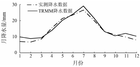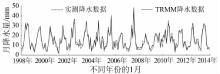 | 图7 1998— 2013年TRMM与实测月均降水量对比Fig.7 Comparison between average monthly precipitation of TRMM and observed data during 1998 to 2013 |