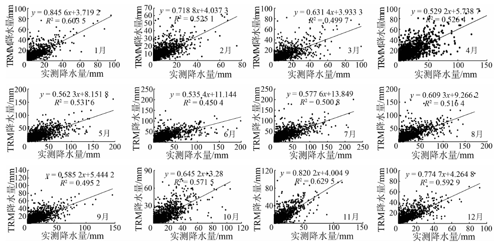 图8为1998— 2013年TRMM与实测降水的1―12月份月平均降水量的拟合结果。