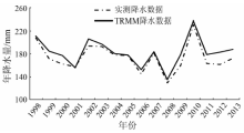 | 图4 TRMM与站点观测1998— 2013年降水量对比Fig.4 Comparison of annual precipitation between TRMM and rain gauges observed from 1998 to 2013 |