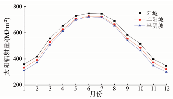 | 实验样区不同坡向太阳辐射量月变化图 |