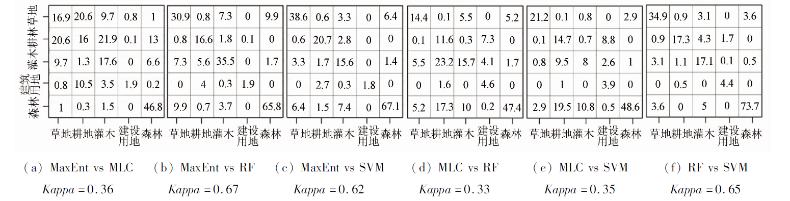 | 图4 4种分类算法分类结果的Kappa一致性检验和混合矩阵 |