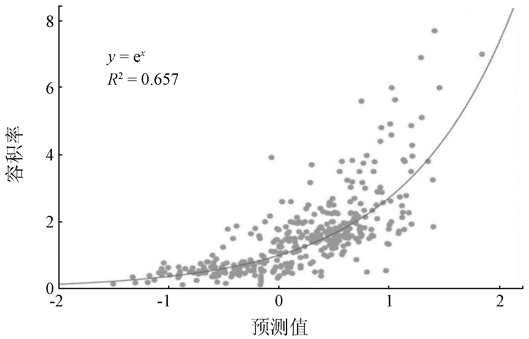 | 图5 呼和浩特中心城区的容积率与变量因子多元回归分析预测值之间的关系 |