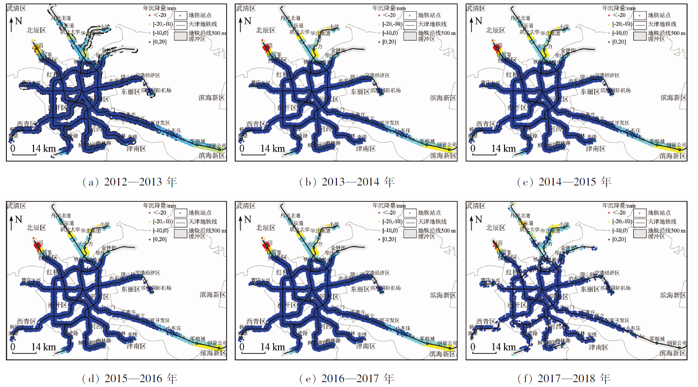 | 图13 天津市地铁线缓冲区年沉降量 |