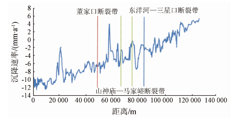 | 图10 明长城沿线沉降速率纵向剖面及断裂带位置 |