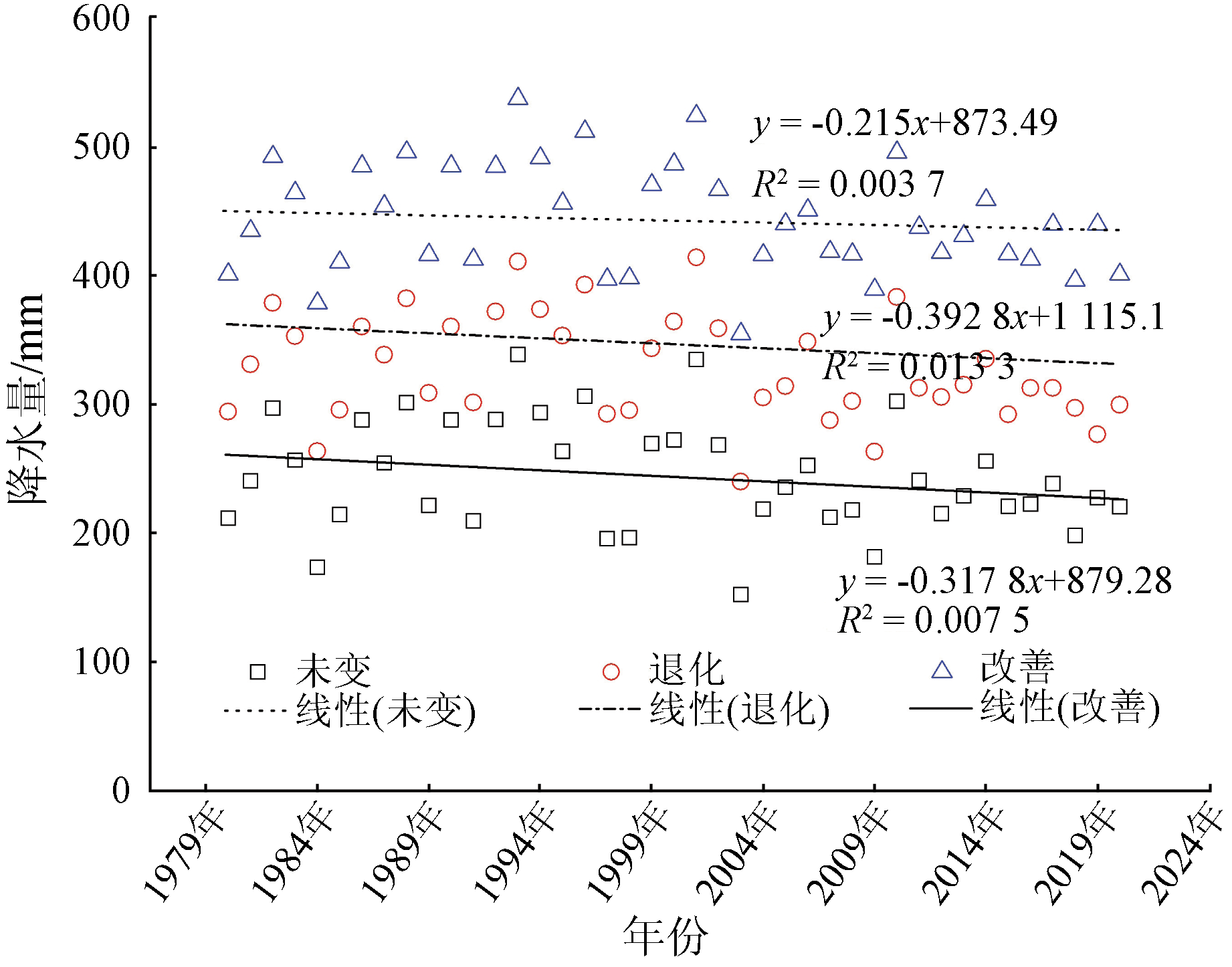 | 图5 研究区1980—2020年各生态风险等级变化区年降水量(退化区+100 mm,改善区+200 mm) |