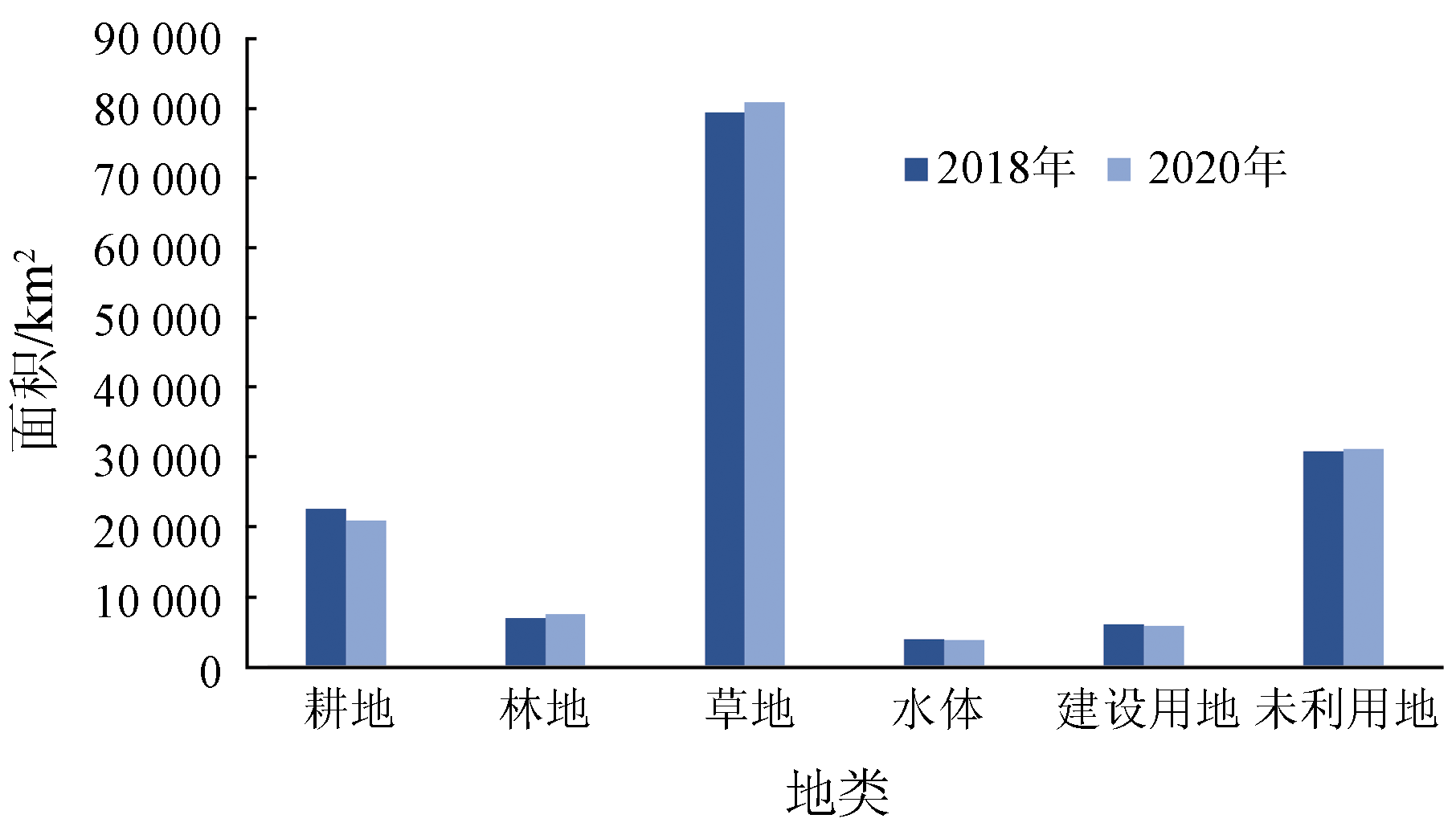 | 图7 2018年和2020年研究区各类型土地面积统计 |